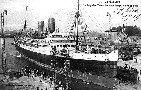 Espagne. El barco, construido en 1909 estuvo en activo hasta el año 1934, en que fue desguazado en Saint-Nazaire. Era un paquebote de acero, con dos hélices, dos mástiles, dos chimeneas y una velocidad máxima de 18 nudos. Tenía una longitud de unos 165 metros y podía alojar a 902 pasajeros distribuidos de la siguiente manera: 296 en primera clase, 106 en segunda clase y 500 (casi hacinados) en tercera.